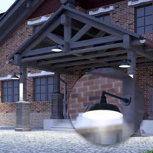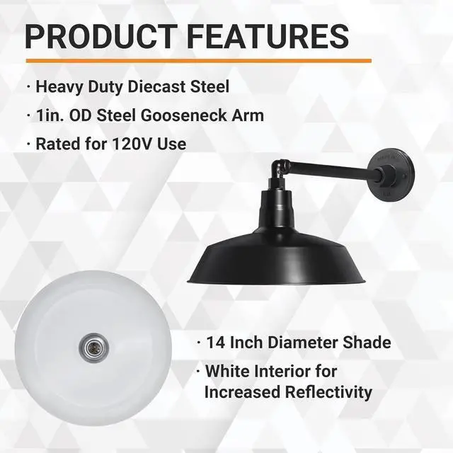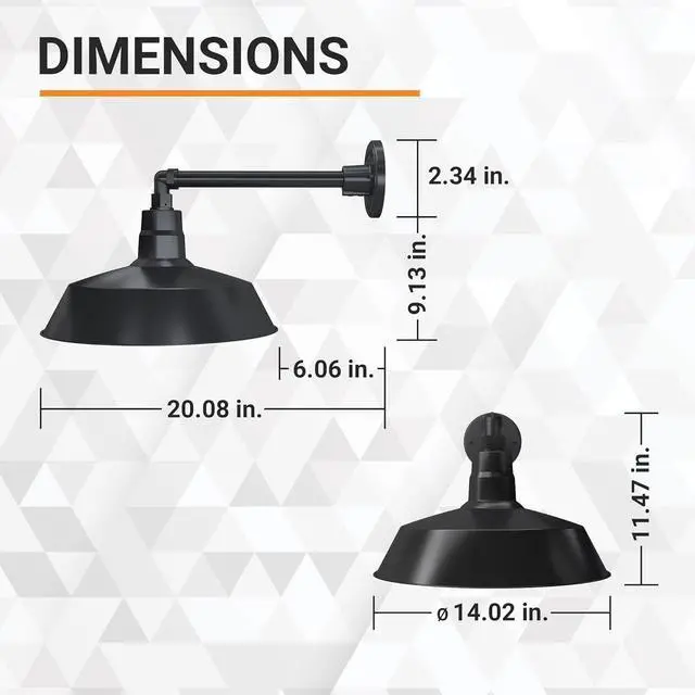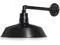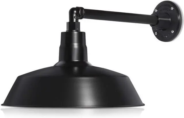 Industrial Straight Arm Design: This Satin Black barn light has a 14 inch shade diameter with 13 inch long straight arm, and extends out a total 20.08 inches from the mounting plate to the end of the shade