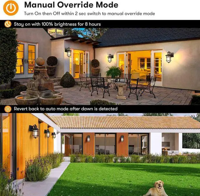 Switchable 2 Lighting Mode, More Choice, Better LifeUnlike other traditional wall sconces that only have single lighting mode, besides the auto on/off function, this dusk to dawn wall light fixture also includes an excellent function: Manual Override Mode. Just simply turn on then off the wall switch within 2 secs, you will get a full brightness that lasts for 8 hours, if needed.
