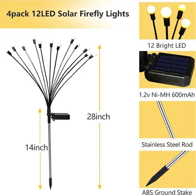 Firefly Light Features: 4Pack x 10 LED firefly bulbs, solar charging energy saving and environmental protection; IP65 waterproof; easy to install, no maintenance; automatic charging (Need to turn on the switch first) and turn on the lighting, a full charge can support 8-10 hours of lighting; easy to move, solar full charge can be moved to any area you want to decorate