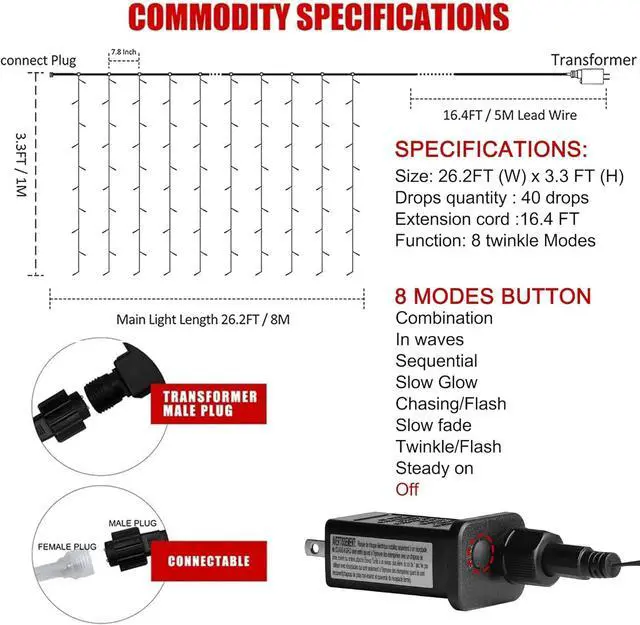 LED Curtain Lights: The soft white waterfall fairy lights come with 40 lights strands and each string contains 10 pcs LED lights. 26ft in width and 3.3 ft in height make it wide and long enough to cover most of PatioGardenRoof especially the large city mall and big party