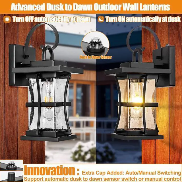 Innovative 2-in-1: Advanced Dusk to Dawn Sensor & Manual ControlDive into the future with our outdoor wall light' s advanced dusk-to-dawn sensor, designed for intelligent, energy-efficient illumination. No more manual switching the outdoor light fixture intuitively turns on as evening approaches and off with dawn. However, for those moments when you desire control, a simple rubber cap allows for manual operation, giving you versatile lighting suited to your environment and preference.