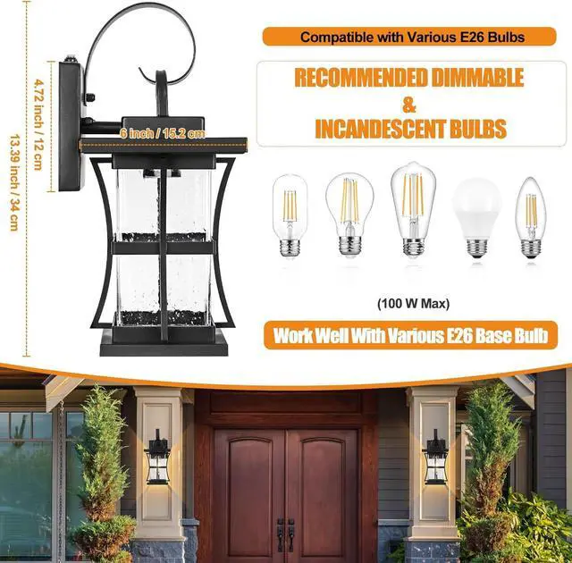 Sophisticated AestheticMarrying modern design cues with timeless elegance, this dusk to dawn porch lights features an eye-catching top hook coupled with delicate curves, destined to become a conversation starter. Its seeded glass is both sturdy and enchanting, producing a gentle light that doesnt glare, making sure your outdoor spaces arent just well-lit but also inviting. Lighting is an art, and our lamp is a masterpiece.