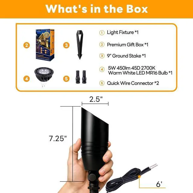 : Outdoor spotlight with a 5 watt LED MR16 bulb (450lm). Lights up exterior trees, walls, flags, and fountains up to 10-12 ft. 180° adjustable while the ground stake stays in place