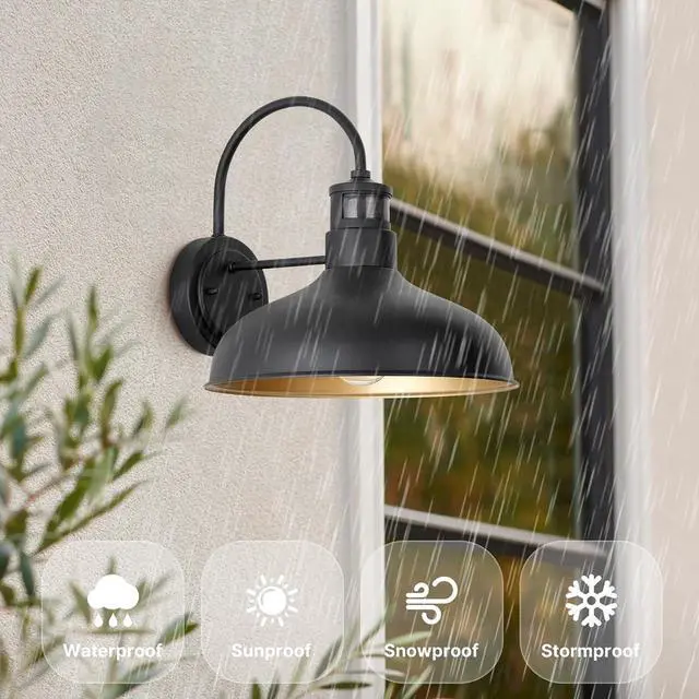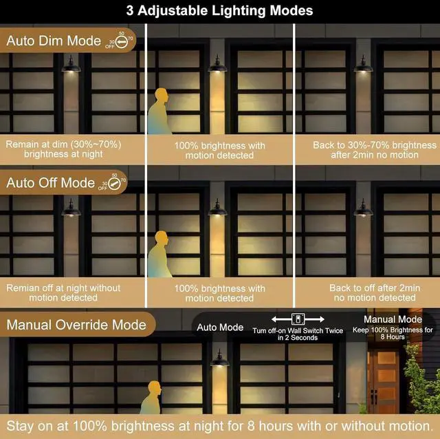Advanced Motion Sensor Barn Light with 3 Lighting Modes: This gooseneck light features 3 modes. Auto Dim Mode, the lights remain at (30%~70%) brightness at night, and light up at full brightness when motion is detected. Auto Off Mode, the wall light remains off at night and turns to full brightness when motion' s detected. The Manual Override Mode, this mode makes sure the fixture stay on at full brightness at night for 8 hours with or without motion. The motion sensing range of 220 degrees and a detection distance of up to 40 feet, will be triggered by humans, animals and cars, will not trggered by wind, snow and rain