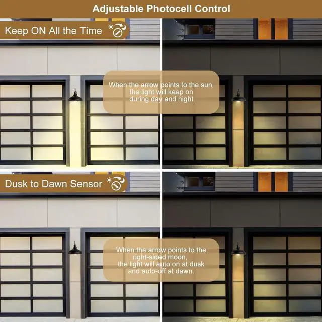 Dawn Light: The photocell sensitivity is adjustable to meet your different needs. When you set the arrow to the right-sided moon on the upper dial, the light will automatically switch on at dusk and will auto-off at dawn; When the arrow pointing to the sun, the light fixture will keep on during day and night; The arrow pointing position between the sun and moon is also adjustable, then the light fixture will start to work by sensing the brightness you set