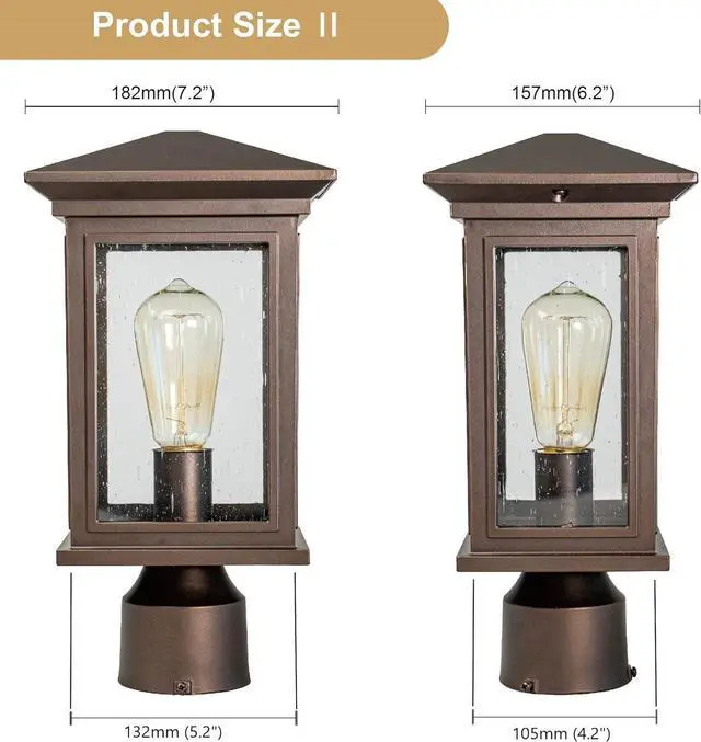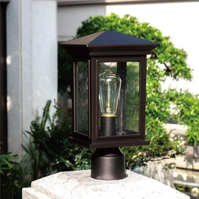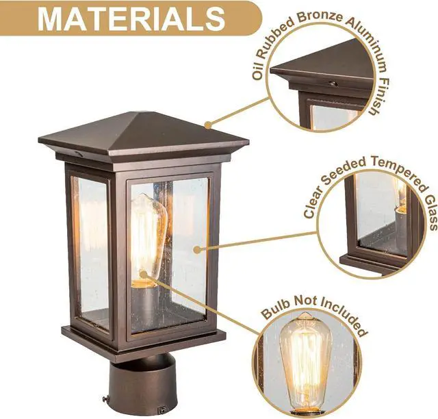 Durable MaterialThis outdoor post light is constructed with ORB die-casting aluminum (Brown color) and tempered clear seeded glass which is ideal for house porch, patio, garage and entryway. These durable materials can effectively resist bad weather such as wind and rain.