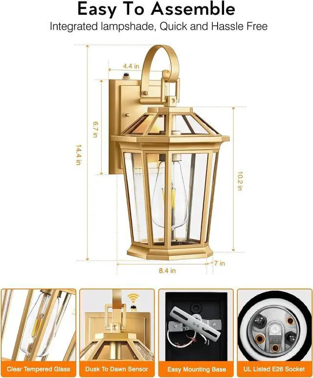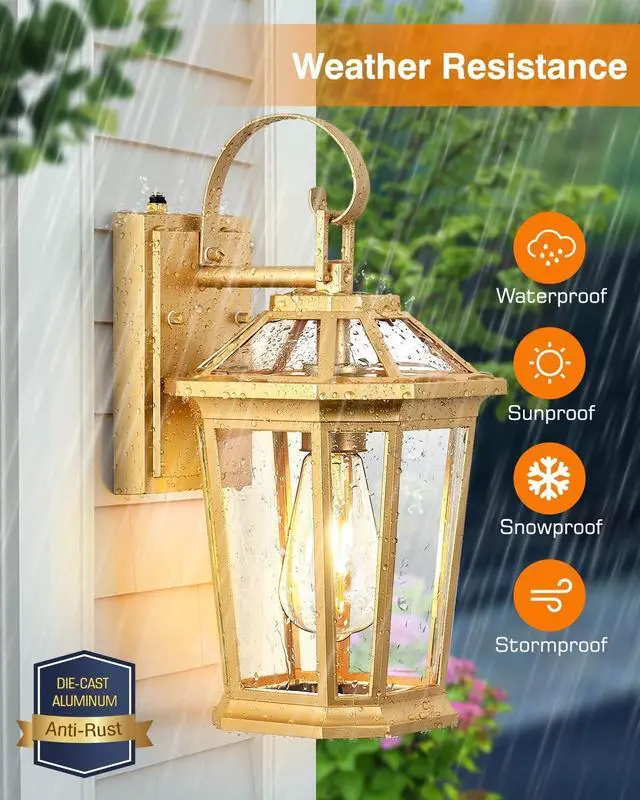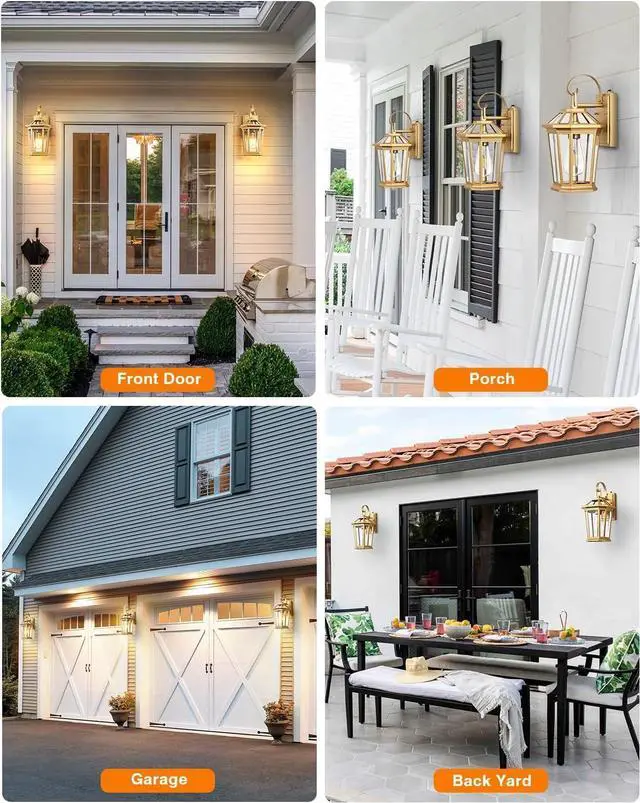 [Unique Appearance] Our outdoor wall light is crafted with a sleek aluminum frame and a durable tempered glass panel, ensuring 360-degree illumination. The gold finish gives the fixture a gorgeous look. The light' s crystal-like elegance enhances the ambiance of your porch, patio, garage, or deck, providing a stunning upgrade to your home.