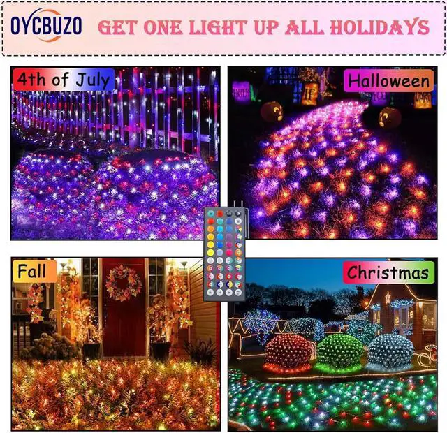 Functional Remote Control: With 44 keys remote control to vitalize the color changing Christmas net lights(2 color choices for St. Patrick' s Day, 4 color choices for Halloween, 4 color choices for Valentine' s, 4 color choices for Christmas). Point the remote control to the adapter, turn on the LED mesh string lights, choose your favorite colors, brightness, modes (Steady On, Blink Flash, Strobe) for bushes, Christmas celebration, or wedding party decorations.