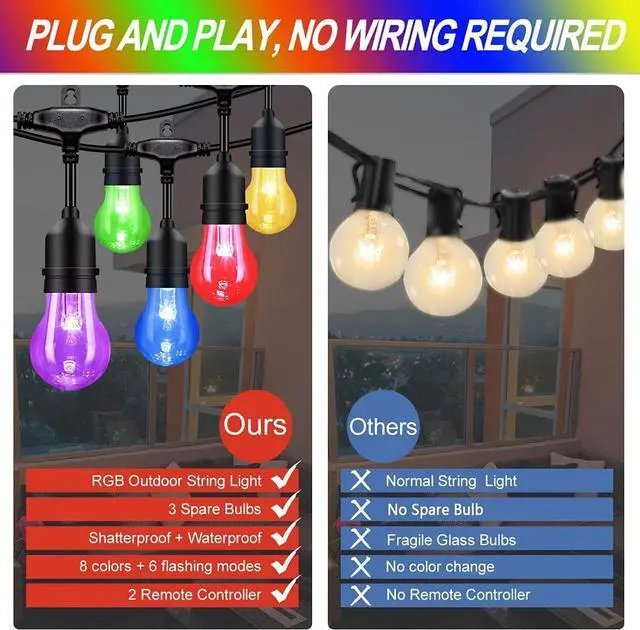 Dimmer Compatible&Perfect Atmosphere: Adopting the most advanced LED chip technology, this RGB lights string glow in TRUE colorful light through clear bulbs. It will create the best mood and aesthetic light show for any patio, deck, backyard, porch, cafe, party, holidays and more.