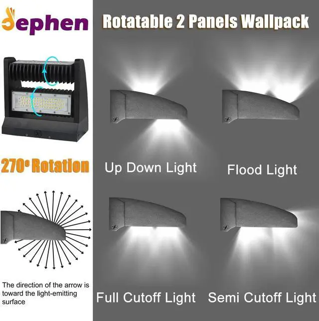 Rotatable Design: The led wall pack light owns 2 independent 270 degrees adjustable LED panels. These rotatable wall packs enable you to customize the lighting range. It can be used as Up Down light / Flood light / full cutoff wallpack / semi cutoff wall pack.