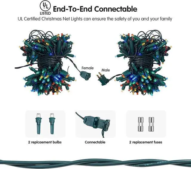 Connectable Christmas Halloween Net Lights: Each Christmas light has an end-to-end connector, support max 12 sets end to end connected, freely conntected according to your demand. Enough to cover larger area. What' s more, our christmas net lights also designed with a long leading and tail wire, meet your needs to have enough distance to lead the power from indoor to outdoor.
