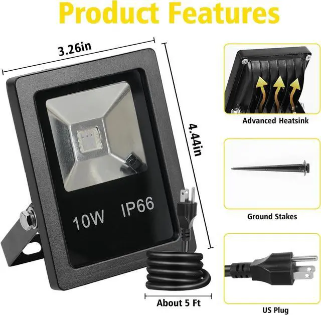 Waterproof and DurableThe 10W RGB flood light is mode of IP65 waterproof, all weathers and seasons resistant. Besides, this led flood light is made of efficiency aluminum for good heat dissipation and durability. Please note that the floodlight can' t be soaked in the water or put it into the water for a long time(Note: The plug is not waterproof).