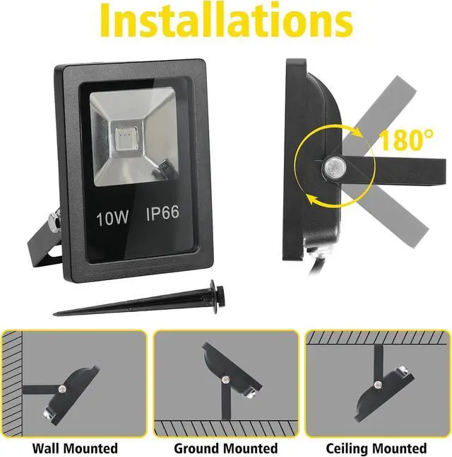 Install the LightsThe 10W led flood light with 180° adjustable lamp body and a bracket, flexible to meet your lighting requirements. It can be mounted at ceiling, wall, ground, etc..