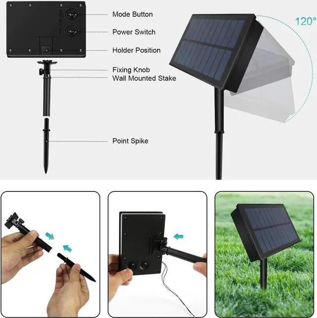 lighting modes: Combination, In Waves, Sequential, Slo-Glo, Chasing/Flash, Slow Fade, Twinkle/Flash, Steady on. Please open the control button behind the solar panel firstly, then it can be use remote for changed lighting mode.