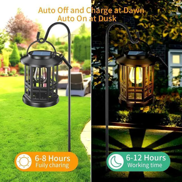 Easy Installation & Auto ON/OFFOur solar lanterns outdoor can be hung or clip on wall, trees, fence, branches, or place them on tables or Porch. Just switch the button in the bottom to " on", the solar powered lanterns can automatically turn on at dusk and off at dawn, offering convenient and energy-efficient lighting.