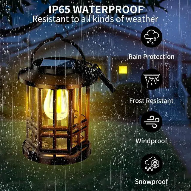All-Weather Resistance Solar LanternOur solar outdoor lantern lights for outside are made of high-strength ABS plastic. Together with decent craftsmanship, the solar lights outdoor waterproof appear exceptionally sturdy. With an IP65 waterproof grade, they withstand rainy, hot, frosty, and snowy weather conditions, ensuring reliable outdoor use.