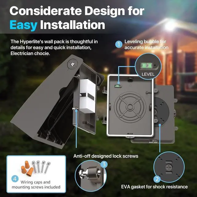 RELIABLE QUALITY - HYPERLITE LED wall pack light has a sturdy die-cast housing, which is super durable and weather-resistant, impact-resistant and corrosion-resistant, with strong heat dissipation and a service life of up to 100, 000 hours.