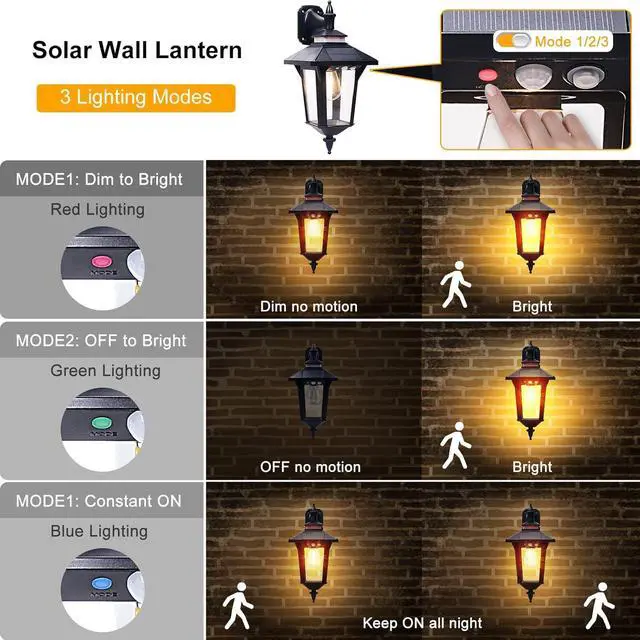 Motion Sensor: The solar wall lantern lights have 3 lighting modes meet your different needs.