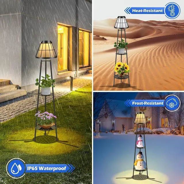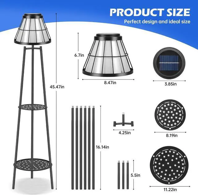 UPGRADED SOLAR FLOOR LAMP Upgraded solar outdoor lamp cleverly combines solar lantern and plant shelf together very well. Our upgraded 45.5 " lights features a double layer of plant shelves, You can put your favorite flowers on the shelf. then place solar lamp on patio, porch, deck, garden to add beautiful. The style is modern and simple, compact and delicate. landscape lighting to creates a romantic atmosphere for your home. Extremely pretty solar powered outdoor decor.