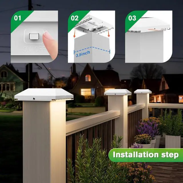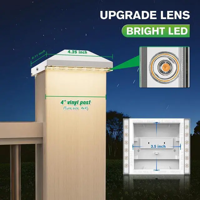 [Easy Installation] Installation is just 3 simple steps, turn on the switch, place it on top of the post, screw it in and done. Then the deck fence post lights aolar powered will recharge itself under direct sunlight and at nightfall is lit up for over 10 hours. It is worth mentioning that this post cap light is mainly used for mounting on 4x4 wood/vinyl posts. Our package contains the actual size of 4x4 one-piece post cap light and a 3.5 * 3.5 adapter. This adapter is built into the bottom of the light, if you find the size is too small when installing, please remove this 3.5 * 3.5 adapter and install again.