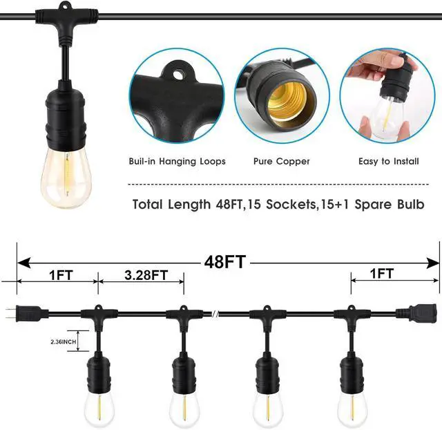 Technical Features48ft outdoor string lights, TCC 2700K, 120V 60Hz, IP65 waterproof, 18AWG SJTW heavy-duty cord, 16 1W S14 energy saving bulbs (1 bulb spare)