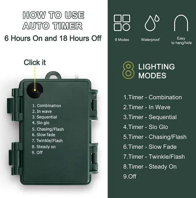 8 Lighting Modes: Combination, In Waves, Sequential, Slow Glow, Chasing/Flash, Slow Fade, Twinkle/Flash, Steady On. Press the button on the battery box to adjust the mode that you like, decor season or light up a unique illuminated backdrop for your family decorations