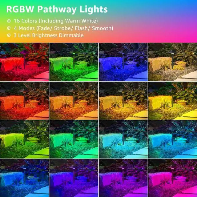Upgraded RGBW Pathway Lights12-pack multi-color pathway lights with 16 bright static colors, 4 color-changing modes (Flash/Strobe/Fade/Smooth), and 3 brightness adjustable, the best choice to add a festive atmosphere to your yard/garden/path. Built-in premium 3000K warm white LED chip, perfect for daily path lighting and landscape lighting.
