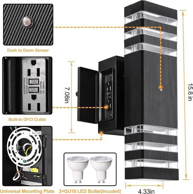 Dusk to Dawn Outdoor LightsThis upgraded porch light with outlet equipped with 2 x GU10 7W LED bulbs (Include Bulbs), has a dusk-to-dawn photoelectric sensor, which can detect the brightness of the ambient light, automatically turn on the outdoor porch light at dusk, and automatically turn off the outdoor porch light at dawn, freeing your hands and bringing more convenience to your life.
