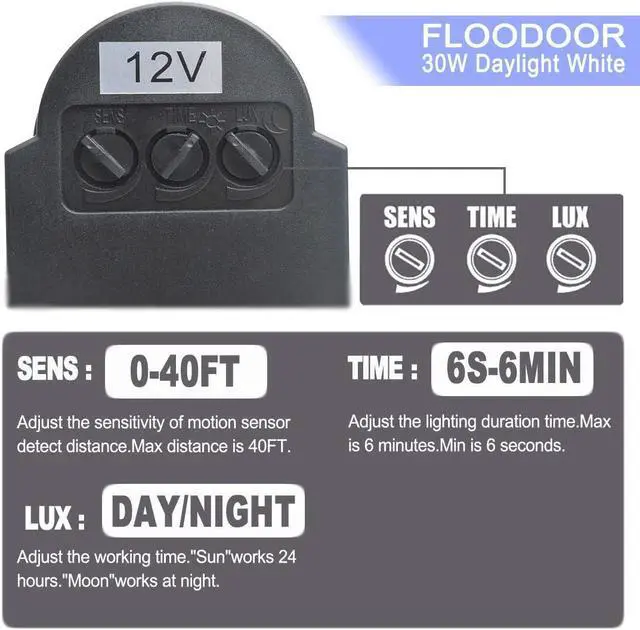 Features: Our Motion Sensor Floodlight Control Sensitivity, Distance (1-30 Feet Adjustable), Lighting Time (6S-360S) and Mode (Day and Month Automatically Distinguish). You are Free to Adjust the Flexible Mode