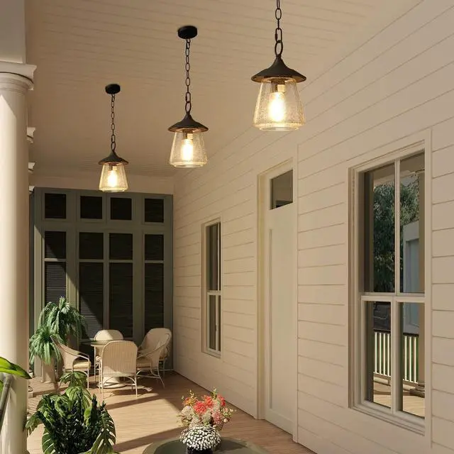 [FARMHOUSE HANGING PORCH LIGHT] Farmhouse-look outdoor lights have tiny bubbles in the glass softly diffuses the light and gives you the look of old glass while the black metal is appealing it, just like what would be in an old farmhouse.