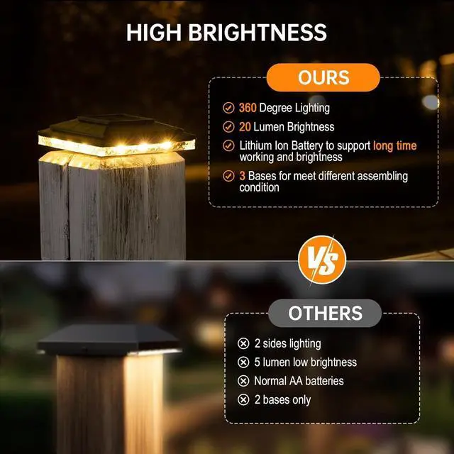 HIGH BRIGHTNESS: Each comes with 12 bright LEDs and more powerful lithium battery, our solar post lights provide a 360 degree lighting, and 20 lumens brightness to your outdoor fence post and deck. Warm white and bright white modes for your choice.