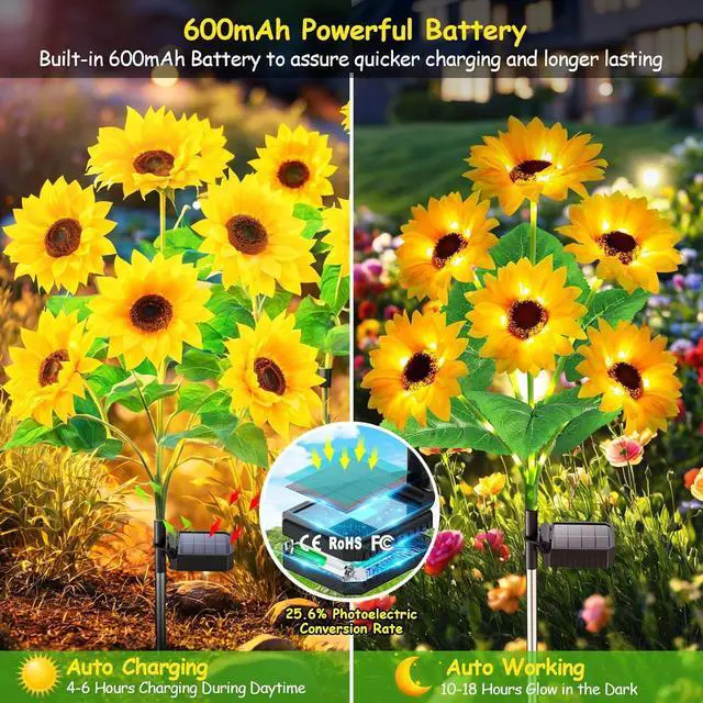 Brighter & Longer Working Time- 6 in 1 sunflowers solar lights outdoor garden with 72 LED string lights, make the petals brighter and more attractive than other outdoor solar lights for yard. Solar flowers lights outdoor waterproof is built-in high quality 1.2V /600mAh Ni-MH rechargeable battery, which means our outdoor solar lights for yard decoration can light up to 18 hours after full charge - much longer working time than other solar garden lights outdoor.