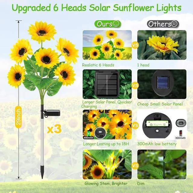 2025 Upgraded Solar Outdoor Lights- Compared to ordinary outdoor solar lights, each solar garden light has 6 sunflower lights. You will get 3 pack solar lights for outside with 18 sunflowers. The petals, leaves and buds are designed to be more delicate and realistic than other sunflower decorations. Featuring larger high conversion solar panels that are 35% more efficient, they can power the solar flower lights all night long to create stunning flower landscape.