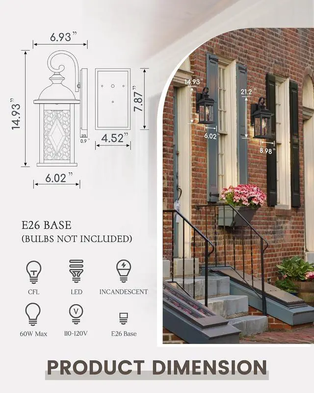 Versatile Bulb Compatibility: This outdoor wall light fixture supports E26 base bulbs (max 60W each), compatible with various options including LED, CFL, and Edison bulbs. Whether for exterior lighting fixtures or your porch light fixture, you can choose the perfect bulb for your lighting needs.