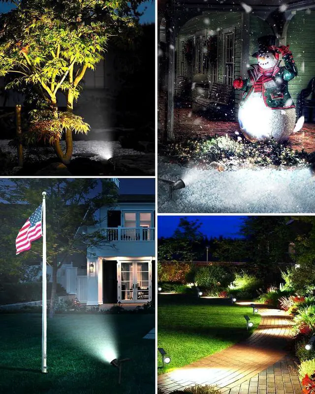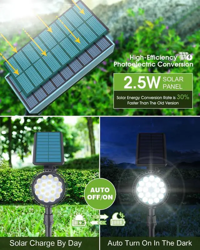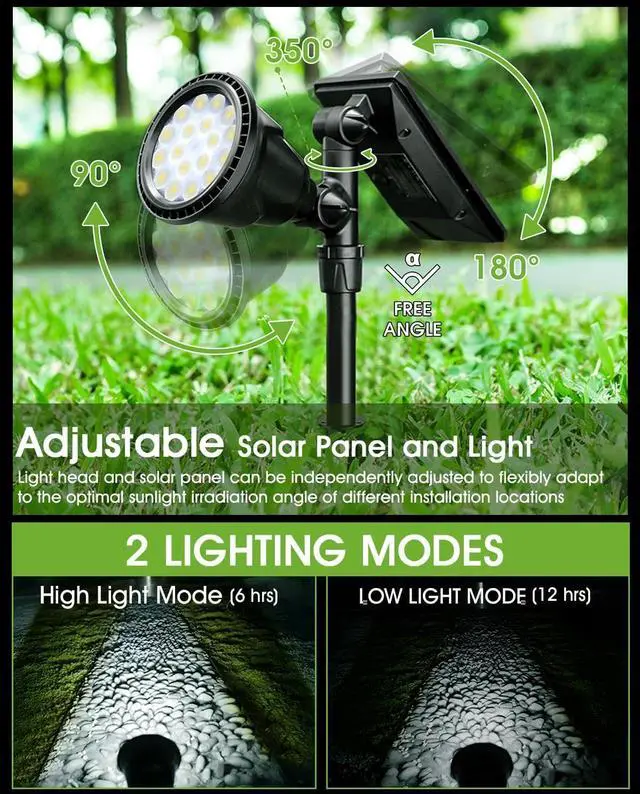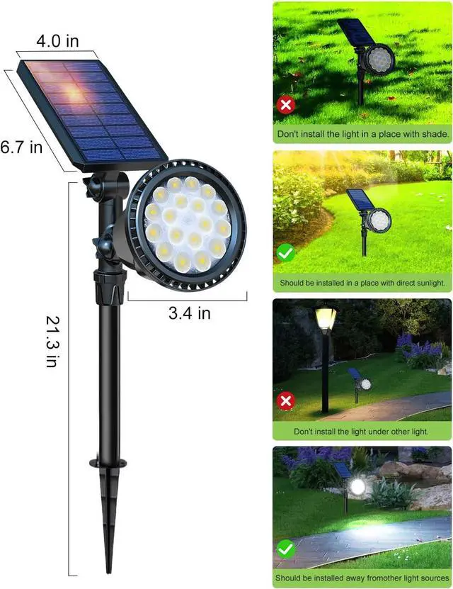 IP65 Waterproof & All Weather-ResistantThis outdoor lights solar powered is IP65 waterproof. High-quality ABS material provides excellent waterproof protection and durability. In addition, the solar outdoor spot lights has built-in PCB board, which additionally adds protection of the waterproof coating, longest lasting life and durability than other yard lights on the market. Optimum for Patio, Porch, Path, Deck, swimming, pool, Yard, Garden, Garage, Driveway, Pathway, etc landscape lighting.