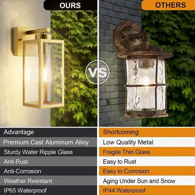 Outdoor Weather ResistantOur gold exterior wall sconces with heavy-duty rugged metal construction and clear glass panels, ideal for any outdoor environment.
