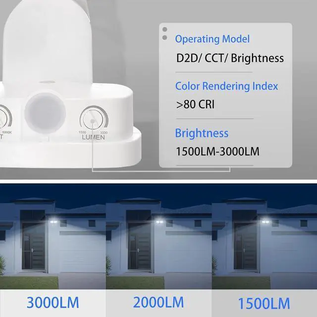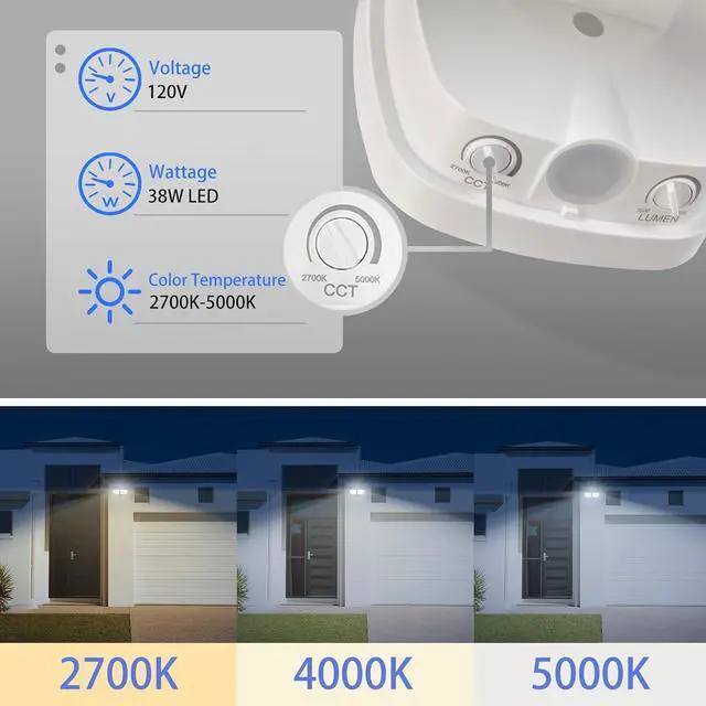 Adjustable Design: The LED outdoor security light features an adjustable 2 head design that allows you to customize the angle at any direction. This AWSENS outdoor flood light also features CCT dimmable technology. You can adjust the CCT color (2700K/ 4000K/ 5000K) from cool (security) to warm (neighbor friendly) by " CCT" switch, and supports 3 lumen levels (1500LM/ 2000LM/ 3000LM) by " LUMEN" switch on the backplate.