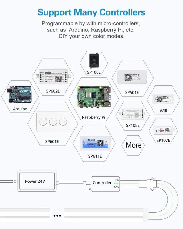 For the controller, your can use our SP105E SP601E SP611E SP638E bluetooth app controllers, SP108E SP548E WiFi Controllers; ASIN(B01LW1J10W, B089Q4TW3J, B0CCNNG1ZX, B0CYSQV3ZR, B07DDB6JHJ, B0D1G3D65X).