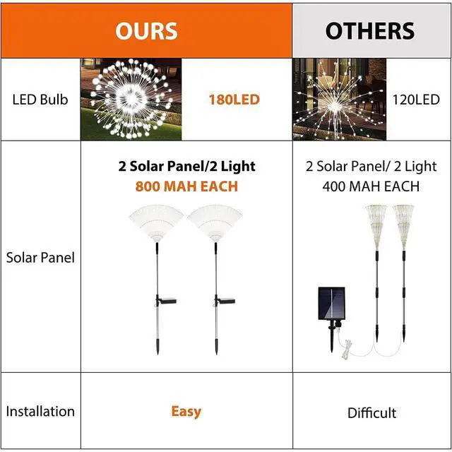 180 LED SOLAR OUTDOOR LIGHTS: Our outdoor lights solar powered has 180 LED beads, which is more beautiful and brighter than other 105 LED and 120 LED fireworks lights. Our upgraded fireworks lights emit many beautiful and colorful light spots like fireworks, illuminating your beautiful garden, yard, sidewalk, etc.