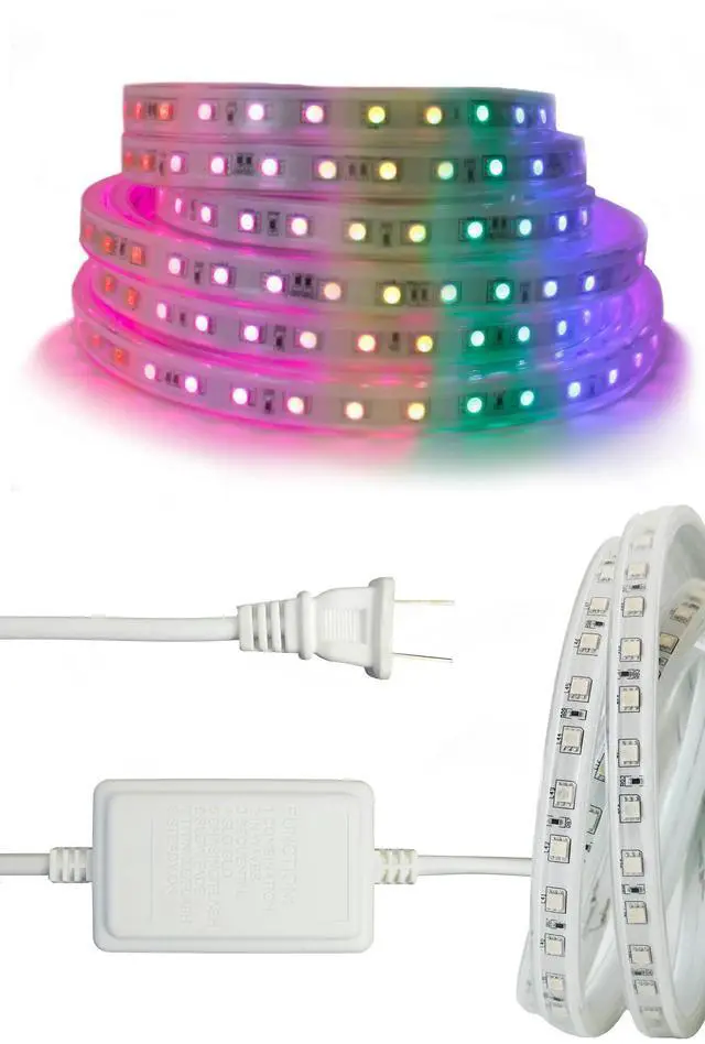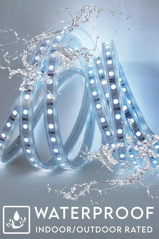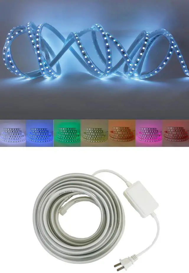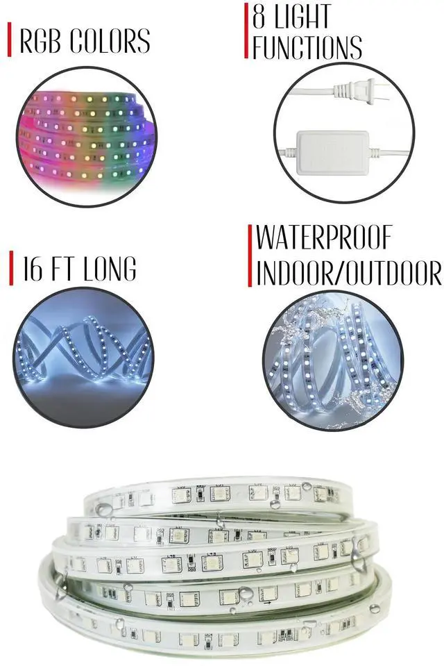 This 16' RGB flexible silicon rope light is fully waterproof and perfect for indoor or outdoor décor. Features 7 vibrant colors and 8 light functions, with remote control for easy operation. Includes adapter with 2-prong plug and 5 hanging brackets for simple installation.