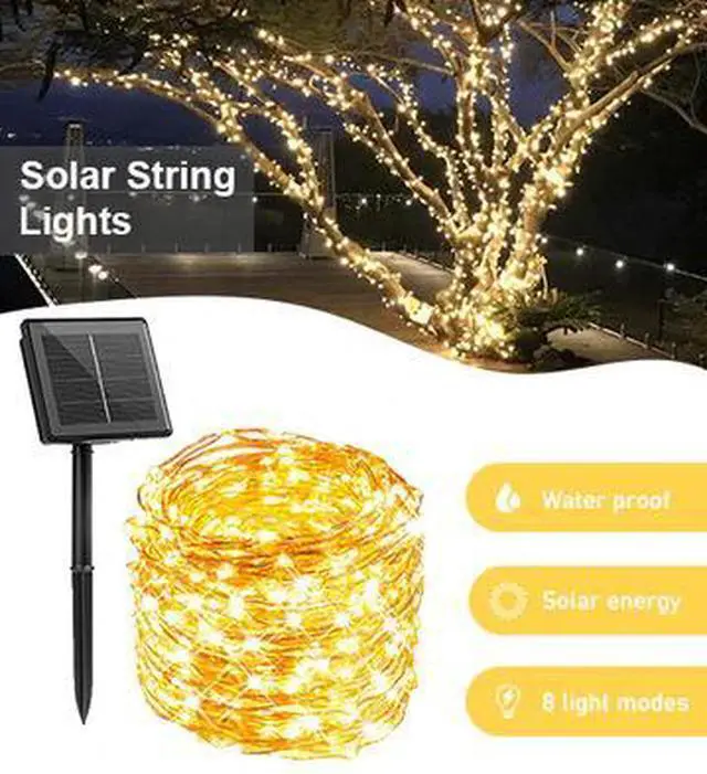 Decorative 72ft copper wire fairy lights with 200 energy-saving LEDs powered by solar. Features 8 light modes perfect for indoor, outdoor, garden, or party decoration.