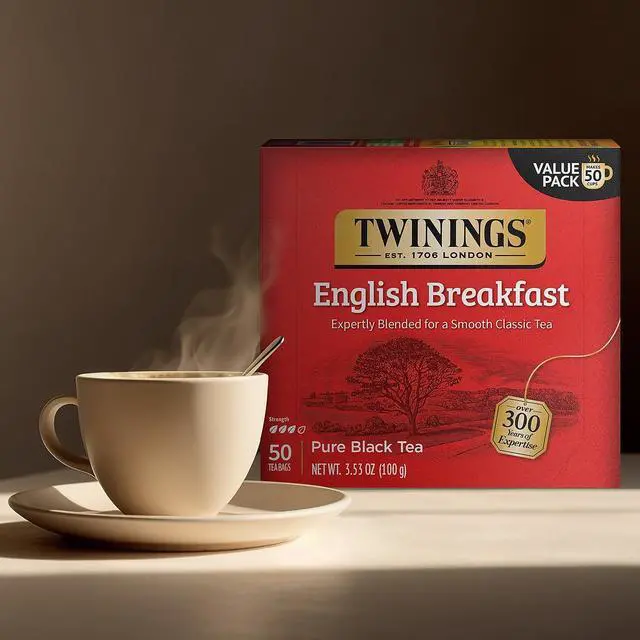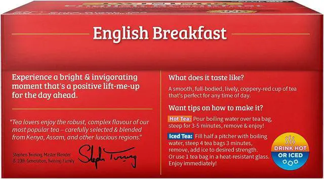 Twinings master blenders travel the world seeking only the finest teas, spices, herbs and fruit infusions available to then expertly blend each one using techniques perfected over 300 years. So whether its refreshing, soothing, spicy or flavorful, theres a Twinings tea to suit your mood throughout the day. Beverage Type: Tea; Flavor: English Breakfast; Product Packaging: Tea Bag; Capacity (Weight): 3.53 oz.