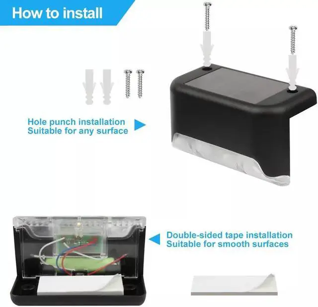 Easy to Install: Screws and adhesive tapes are included. If you don't want to drill holes in the deck rail, secure the solar lights with adhesive tapes.