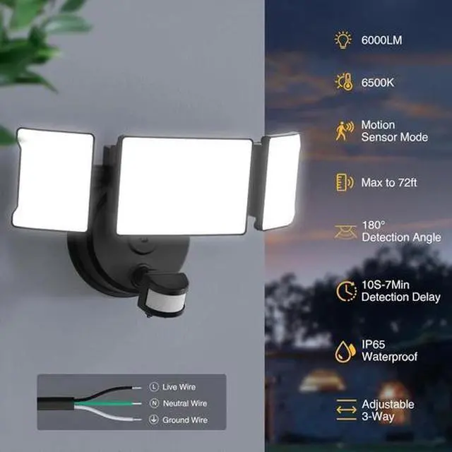 - Ultra Bright and Energy Efficient: Motion sensor flood lights deliver up to 6000 lumens of brightness, suitable for yards, garages, driveways, and porches. Motion-activated for energy savings, they only light up when needed, extending their lifespan