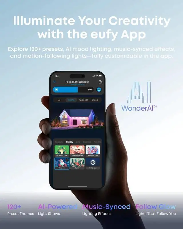 Colorful and Interactive Lighting: Choose from 120 presets with the app, ranging from everyday moods to festive effects, including Halloween and Christmas, to suit any occasion. With AI-powered voice interaction, simply describe the vibe you're looking for, and the system intelligently matches and generates personalized lighting effects. The music flow function analyzes real-time audio, allowing the lights to sync and dance with the rhythm.