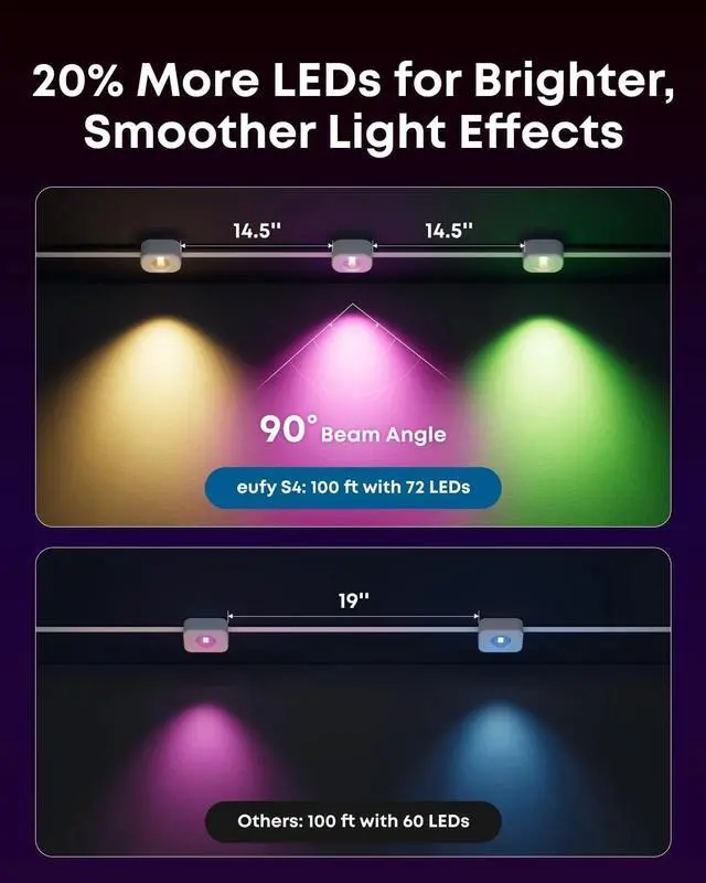 Cut and Extend as You Need: The cuttable design allows you to customize the length and layout to match various roof shapes. Note: - eufy Permanent Outdoor Lights S4 is not compatible with the eufy Permanent Outdoor Lights E22 extension cable or lights. - The total length of the light strip should not exceed 200 ft / 60 m. - The total length after adding the extension cable should not exceed 232 ft / 70 m.