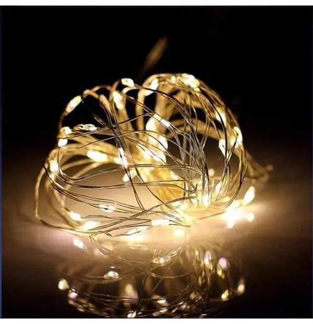 Silver copper wire dotted with 100 tiny LED lights creates a stunning glow. Available in a variety of colors, these plug-in fairy lights are perfect for lining walls, wrapping stairway railings, or adding sparkle to any space. Bendable wire allows for creative placement.