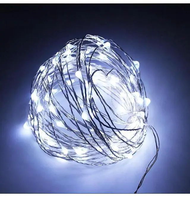 Silver copper wire dotted with 100 tiny LED lights creates a stunning glow. Available in a variety of colors, these plug-in fairy lights are perfect for lining walls, wrapping stairway railings, or adding sparkle to any space. Bendable wire allows for creative placement.