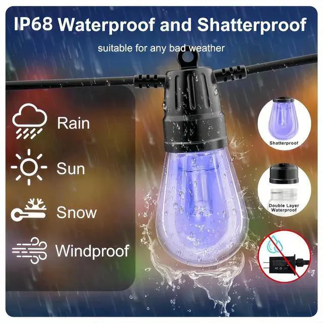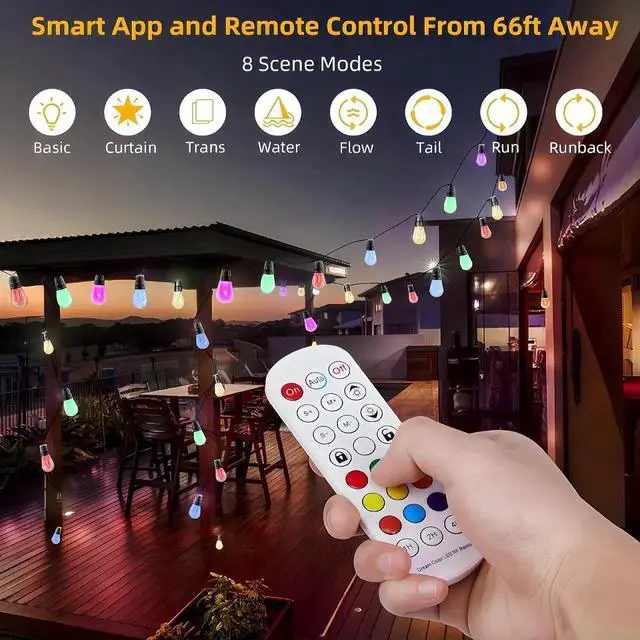 IP66 Waterproof and Shatterproof String Lights: The RGB patio lights with IP66 waterproof performance and well-structured transparent 15 shatterproof hard plastic bulbs, not easy to deform. String lights for outside enjoy year-round outdoor lights no matter the weather. You will love to use different colors to reflect the different