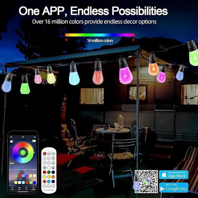 Creative APP & Remote Control RGB Outdoor String Lights: Color Changing String Light With the included remote control, you can change the power on/off, brightness, and mode within a range of 15 meters, without having to aim at the controller box. An APP for more in depth settings, the control made string lights for outside has become easier and more creative than ever